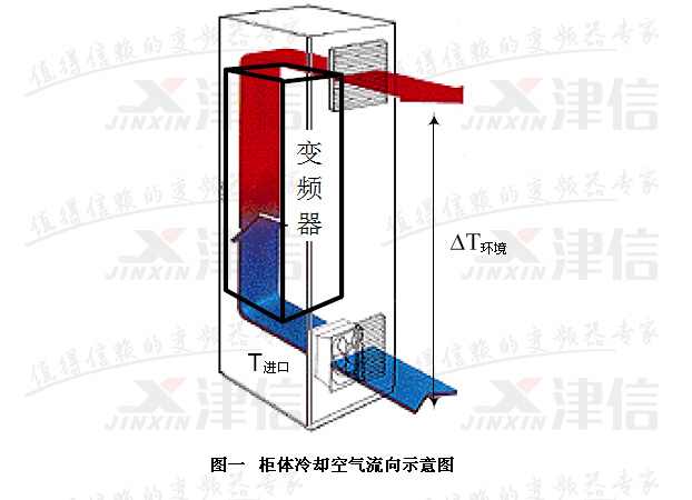 變頻器一般通過變頻器內(nèi)置的風(fēng)扇來散熱,如果變頻器安排在柜體內(nèi),這會導(dǎo)致柜體溫度升高。雖然柜體的柜壁也有一定的散熱能力,但是由于柜體的柜壁散熱能力小于50W,在計(jì)算中,這部分散熱可以忽略不計(jì),所以還需要采取其他外部措施來散熱。最典型的散熱方式是在柜門或柜壁上安裝風(fēng)扇,如圖一所示。