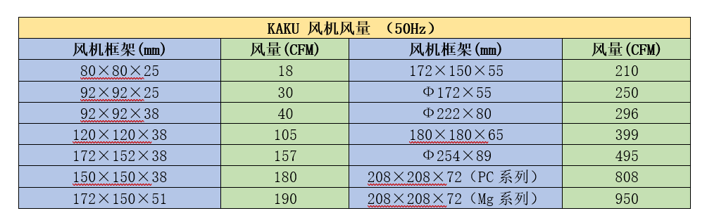 下表列出市場上比較常見的卡固(KAKU)風(fēng)機(jī)的數(shù)據(jù),作為我們上面例子的風(fēng)機(jī)選型參考。