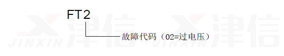 當偉肯變頻器出現(xiàn)故障時,偉肯變頻器會停止運轉,并且在顯示器上以如下的格式閃爍顯示符號FT 和故障代碼。例如: