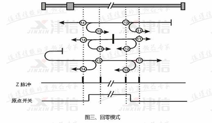 根據(jù)客戶要求,選擇的回零方式為:回零時(shí)反轉(zhuǎn),找到零位信號后,伺服開始正轉(zhuǎn),找到第一個(gè)Z相脈沖后再偏移一定的原點(diǎn)偏移量,回零方式如圖三所示。