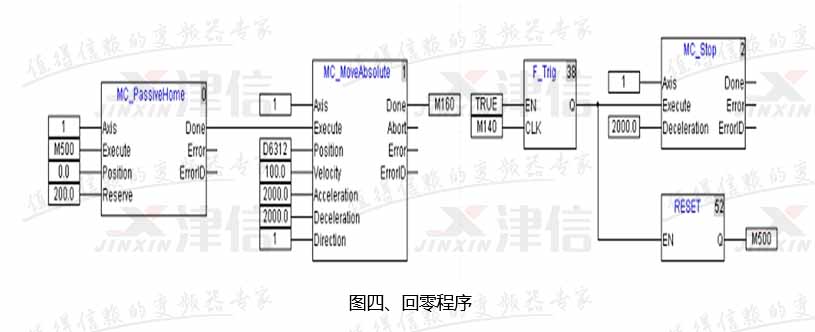 在執(zhí)行回零的過程中,如發(fā)生故障或按下急停,則調(diào)用“MC_Stop”指令來使當(dāng)前軸停止回零動(dòng)作。程序如圖四所示: