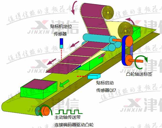 凸輪軸接收來自主軸的脈沖信號,依主軸節奏進行貼標動作,傳送標簽時需很準確平穩,在粘貼標簽時,必須要能穩定控制運行速度與主軸同步,否則標簽貼起來會不平順。